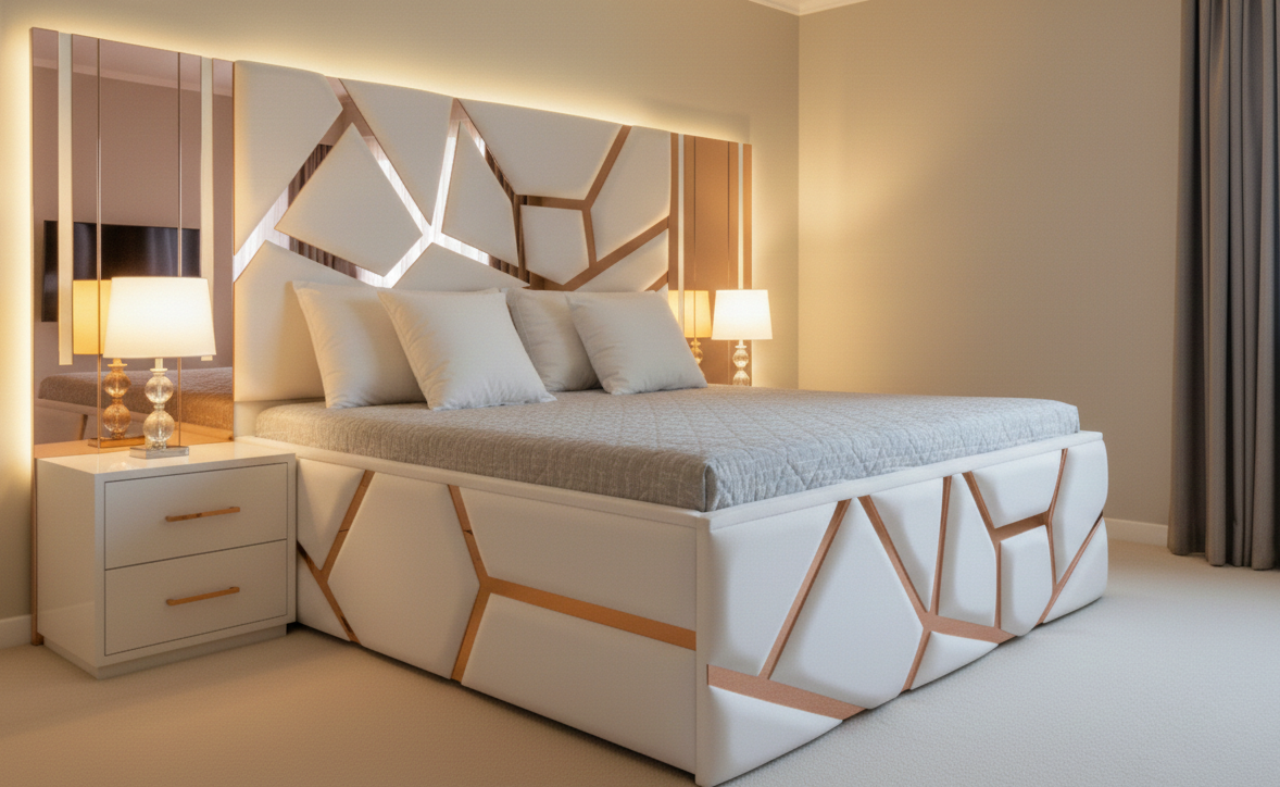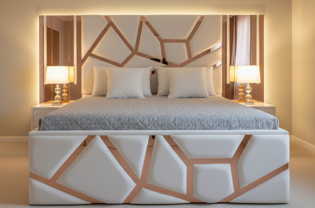 Base Coordinada: El marco de la cama mantiene el lenguaje visual de la cabecera, con cortes geométricos y detalles en oro rosa que le dan una apariencia robusta y lujosa desde cualquier ángulo.