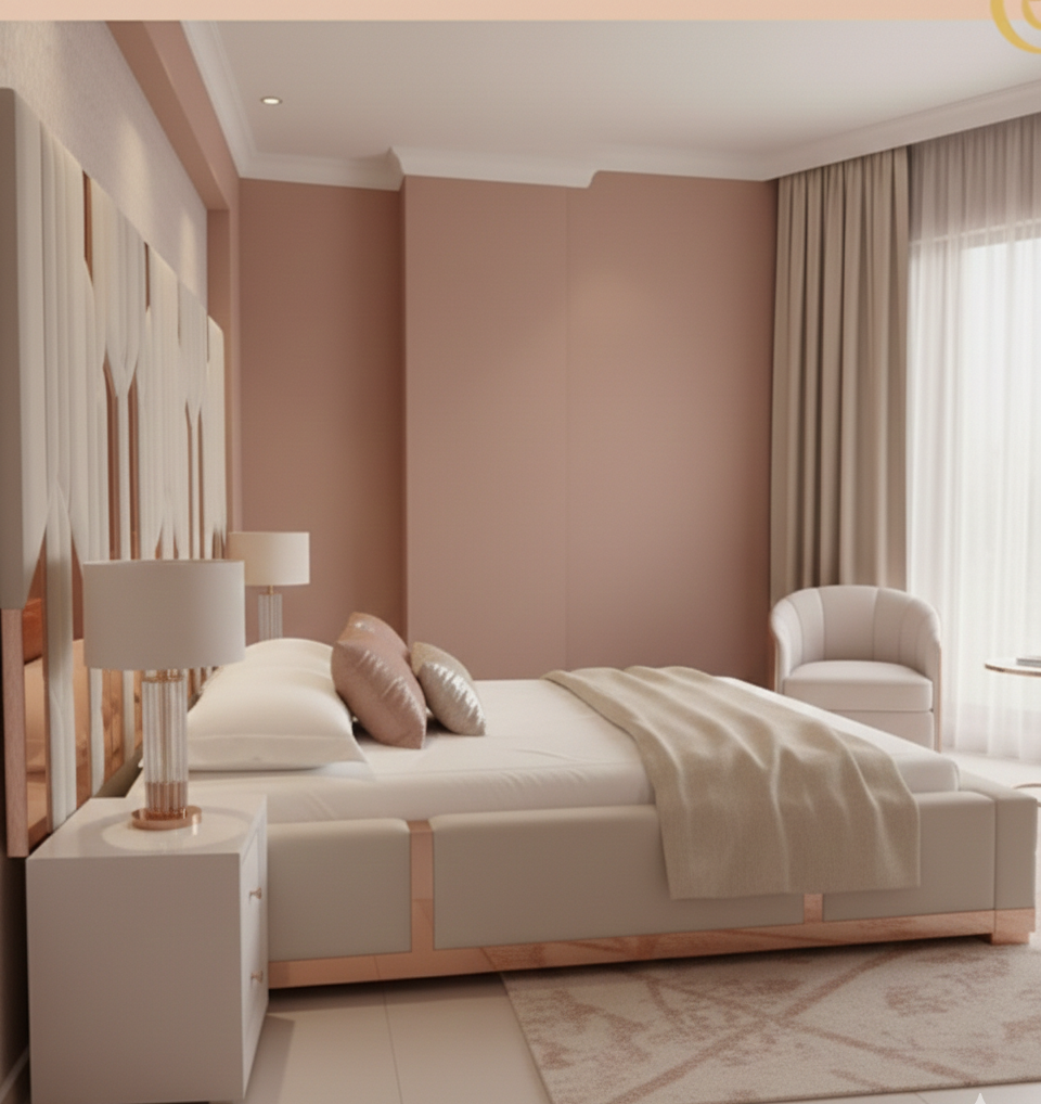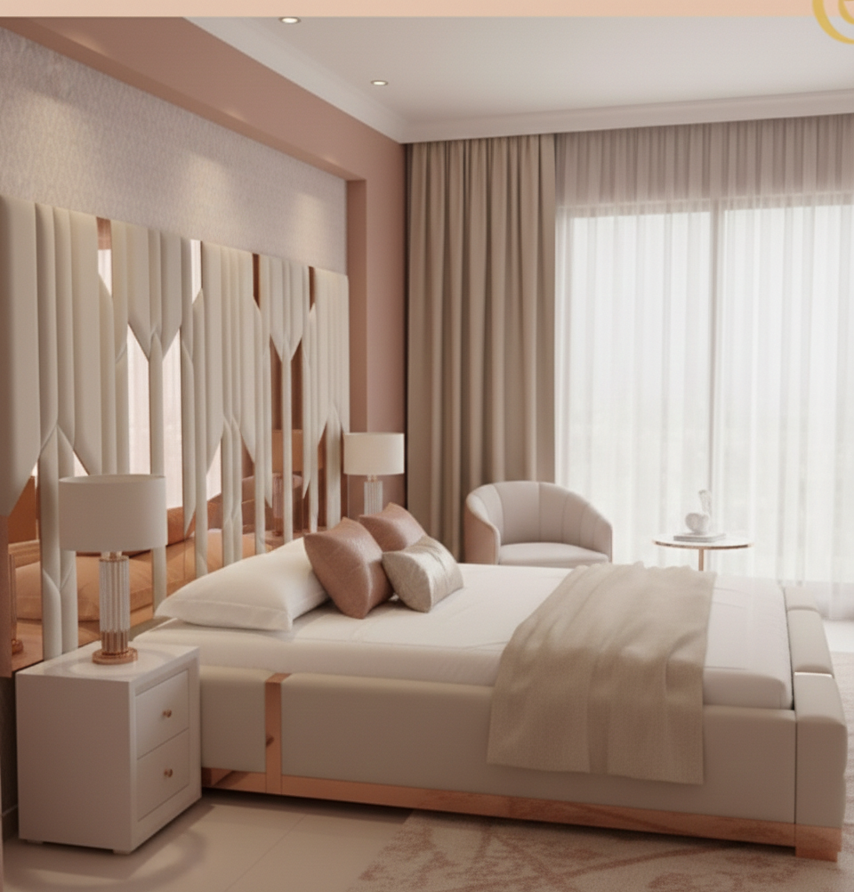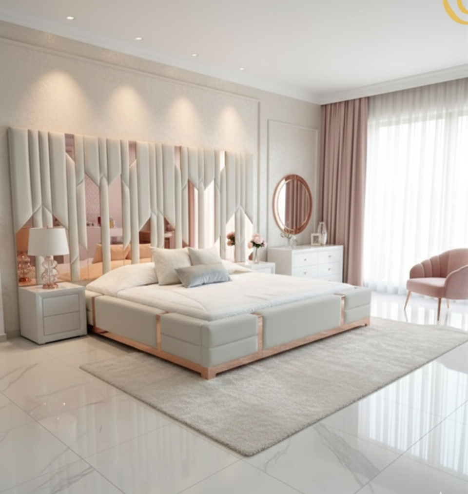 Lo que realmente hace destacar a la Aurora Premium es la calidad superior de sus componentes. Incorpora espejos en tono palo de rosa de excelente calidad, los cuales están integrados de forma artística en el cabecero para captar la luz y aportar un brillo cálido y exclusivo al ambiente. Cada acabado ha sido cuidadosamente seleccionado para asegurar una textura agradable al tacto y una durabilidad excepcional a través del tiempo.